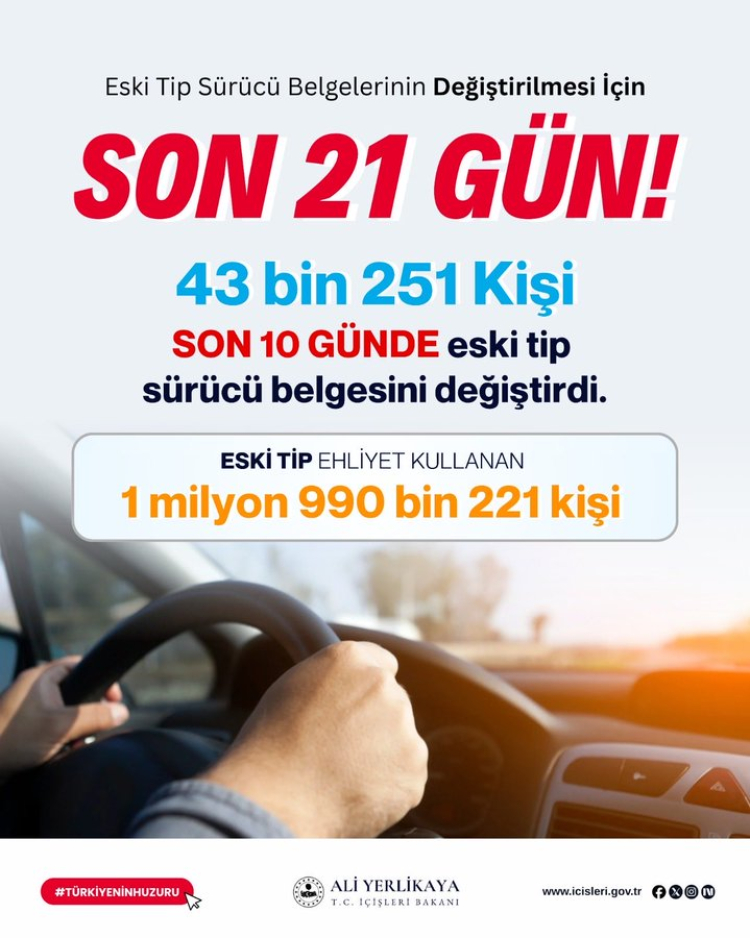 Paylaşımda, halen 1 milyon 990 bin 221 vatandaşın eski tip sürücü belgesi kullandığı belirtilerek, değişim hızının yetersiz olduğu vurgulandı.