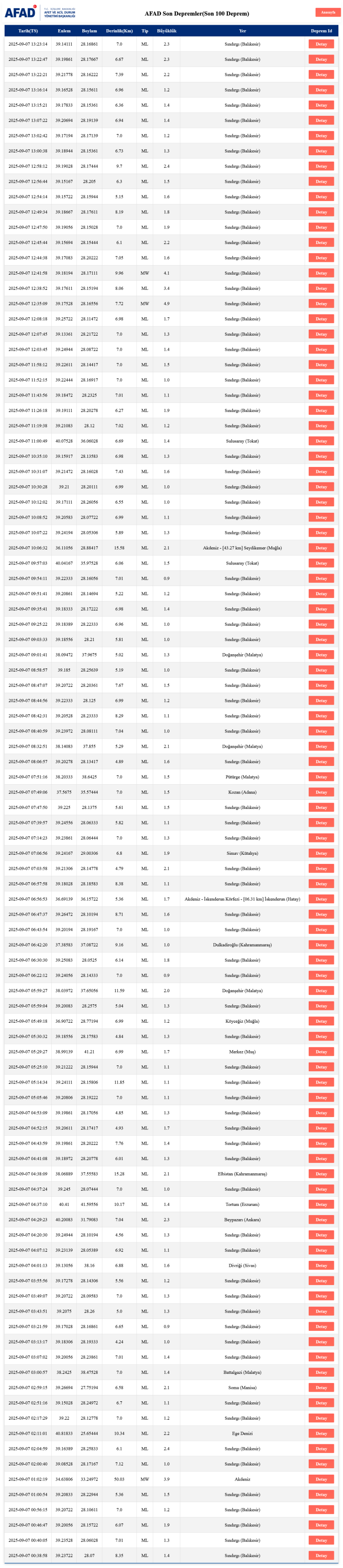 BURSA (İGFA) – Afet ve Acil Durum Yönetimi Başkanlığı (AFAD) verilerine göre, 7 Eylül 2025 tarihinde Balıkesir’in Sındırgı ilçesinde gün boyunca çok sayıda deprem kaydedildi.