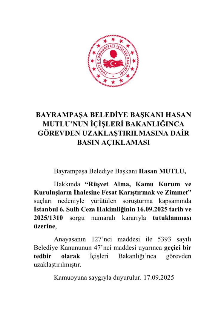 İçişleri Bakanlığı, rüşvet alma, kamu kurum ve kuruluşların ihalesine fesat karıştırma ve zimmet suçlamalarıyla yürütülen soruşturma kapsamında tutuklanan Bayrampaşa Belediye Başkanı Hasan Mutlu’yu görevden uzaklaştırdı.