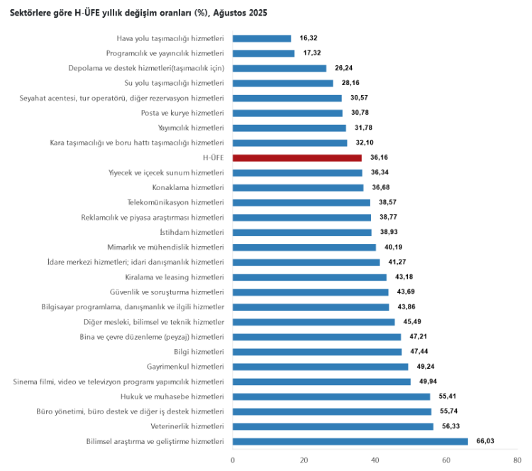 Bir önceki yılın aynı ayına göre ulaştırma ve depolama hizmetlerinde yüzde 28,91 artış, konaklama ve yiyecek hizmetlerinde yüzde 36,51, bilgi ve iletişim hizmetlerinde yüzde 41,62, gayrimenkul hizmetlerinde yüzde 49,24, mesleki, bilimsel ve teknik hizmetlerde yüzde 47,17, idari ve destek hizmetlerde yüzde 41,54 yükseldi.