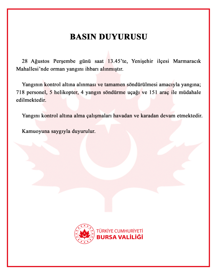 Valilikten yapılan açıklamada, yangına 718 personel, 5 helikopter, 4 yangın söndürme uçağı ve 151 araçla havadan ve karadan müdahale edildiği belirtildi.