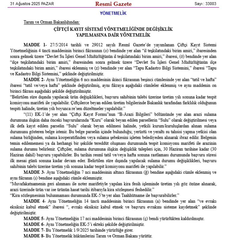 Tarım ve Orman Bakanlığı, Çiftçi Kayıt Sistemi Yönetmeliği’nde yapılan değişiklikleri bugünkü Resmi Gazete’de yayımladı. Sulama durumu değişiklikleri ve kira sözleşmesi süreçleri kolaylaştırılırken yeni düzenlemeler 1 Eylül’de yürürlüğe girecek.