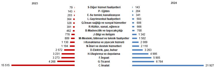 2024’te faal olan 3 milyon 942 bin 781 girişimin yüzde 44,4’ü hizmet sektöründe, yüzde 35,1’i ticaret sektöründe yer aldı. İstihdamda ise hizmet sektörü yüzde 39,2’lik payla lider olurken, sanayi sektörü yüzde 27,2’lik pay aldı. Toplam istihdam 19 milyon 789 bin 7 kişi olarak gerçekleşti.