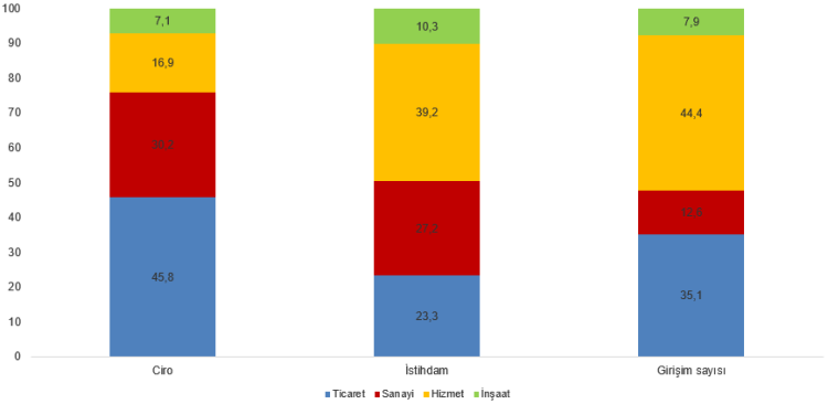 2024 yılı verileirne göre hizmet sektörü girişim sayısı ve istihdamda lider, ticaret sektörü ise ciroda öne çıktı. 2024’te Türkiye’de hizmet sektörü girişimlerin yüzde 44,4’ünü ve istihdamın yüzde 39,2’sini oluştururken, ticaret sektörü yüzde 45,8’lik payla ciroda zirvede yer aldı.