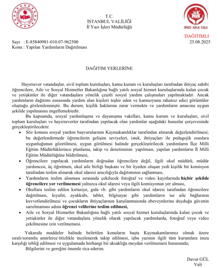 İstanbul Valisi Davut Gül, sosyal yardım dağıtımlarında kişilik haklarını korumak için yeni kurallar getirdi. Yardımlar, Kaymakamlıklar ve okul idareleri aracılığıyla dağıtılacak, yardım alanların görüntülenmesi yasaklandı.