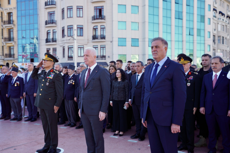 İstanbul Valisi Davut Gül, 1. Ordu ve İstanbul Garnizon Komutanı Orgeneral Bahtiyar Ersay ve İBB Başkanvekili Nuri Aslan’ın katılımıyla gerçekleştirilen tören, saygı duruşunda bulunulması ve İstiklal Marşı’nın okunmasıyla başladı. Daha sonra sırasıyla Gül, Bahtiyar ve Aslan kurumları adına Cumhuriyet Anıtı’na çelenk bıraktı. İBB Başkanvekilil Nuri Aslan, Özel Defteri’ne yazdığı mesajı okudu.