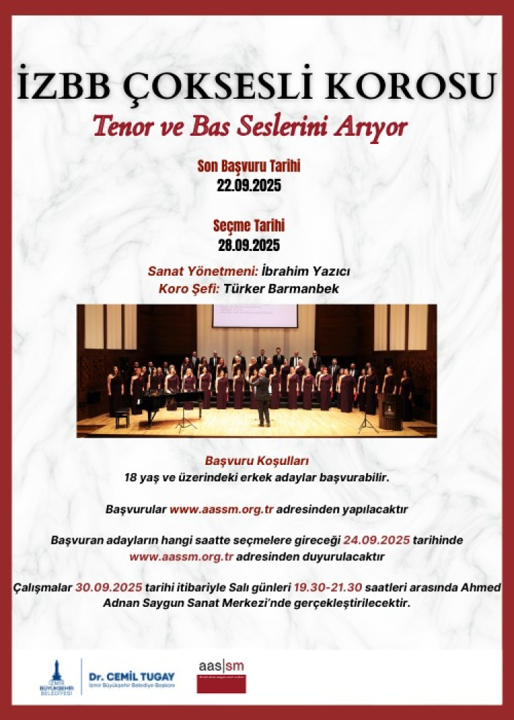 İzmir Büyükşehir Belediyesi Çoksesli Korosu’na ise 18 yaş ve üzerindeki erkek adaylar başvurabiliyor. Çalışmalar, 30 Eylül tarihi itibariyle salı günleri 19.30-21.30 saatleri arasında Ahmed Adnan Saygun Sanat Merkezi’nde gerçekleştirilecek.
