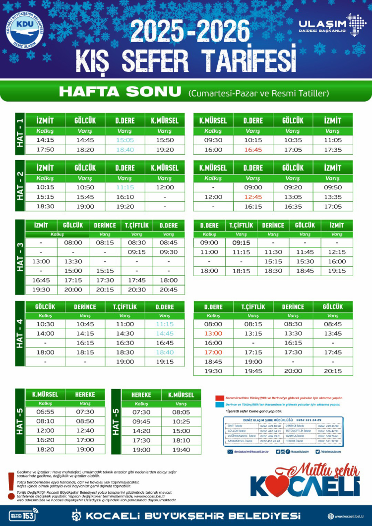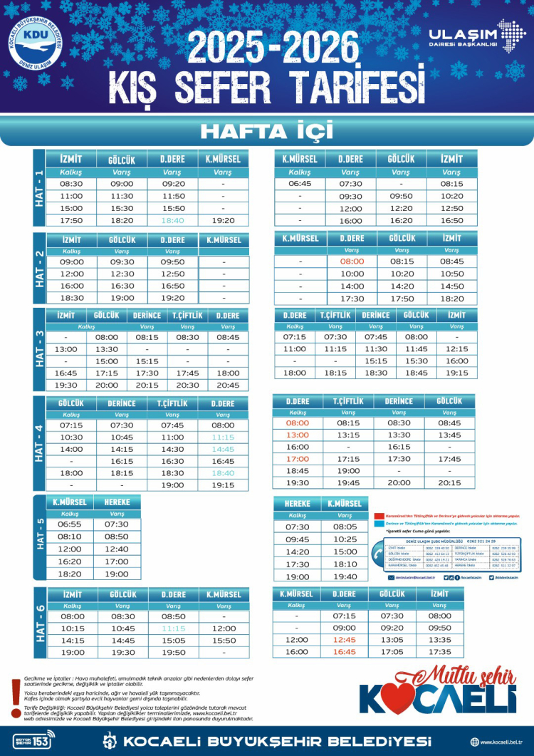KOCAELİ (İGFA) – Kocaeli Büyükşehir Belediyesi, 8 Eylül Pazartesi günü itibarıyla deniz ulaşımında kış tarifesine geçiyor.