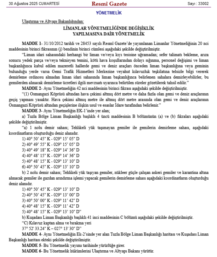 Ulaştırma ve Altyapı Bakanlığı, Limanlar Yönetmeliği’nde değişiklik yaptı. Osmangazi Köprüsü’nden geçiş kuralları güncellendi, Tuzla ve Kuşadası’nda demirleme sahaları ve kılavuz kaptan noktaları yeniden düzenlendi. Yönetmelik, bugünkü Resmi Gazete’de yayımlanarak yürürlüğe girdi.