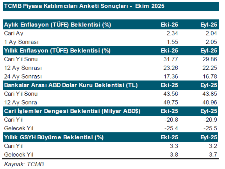 ANKARA (İGFA) – Türkiye Cumhuriyet Merkez Bankası (TCMB), Ekim 2025 Piyasa Katılımcıları Anketi sonuçlarını açıkladı.