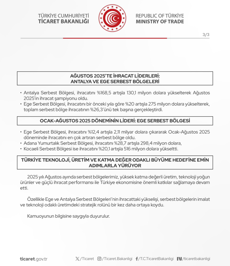 Ticaret Bakanlığı, Türkiye’nin serbest bölgelerinin Ağustos 2025’te tarihi bir başarıya imza attığını duyurdu. İhracat, bir önceki yıla göre yüzde 9,4 artarak 1 milyar 45 milyon dolara ulaşarak tüm zamanların en yüksek Ağustos ayı ihracat rekorunu kırdı.