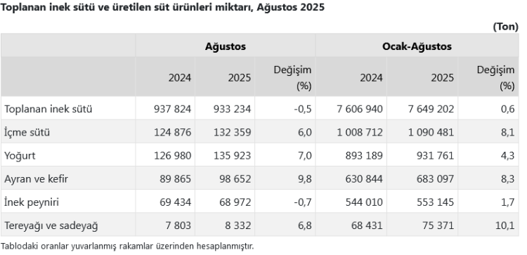 Türkiye İstatistik Kurumu (TÜİK), Ağustos 2025’te ticari süt işletmelerince 933 bin 234 ton inek sütü toplandığını duyurdu. Ocak-Ağustos döneminde süt toplama yüzde 0,6 artarken, süt ürünleri üretiminde artış gözlendi: Ayran ve kefir yüzde 8,3, yoğurt yüzde 4,3, içme sütü yüzde 8,1, tereyağı ve sadeyağ yüzde 10,1 yükseldi.