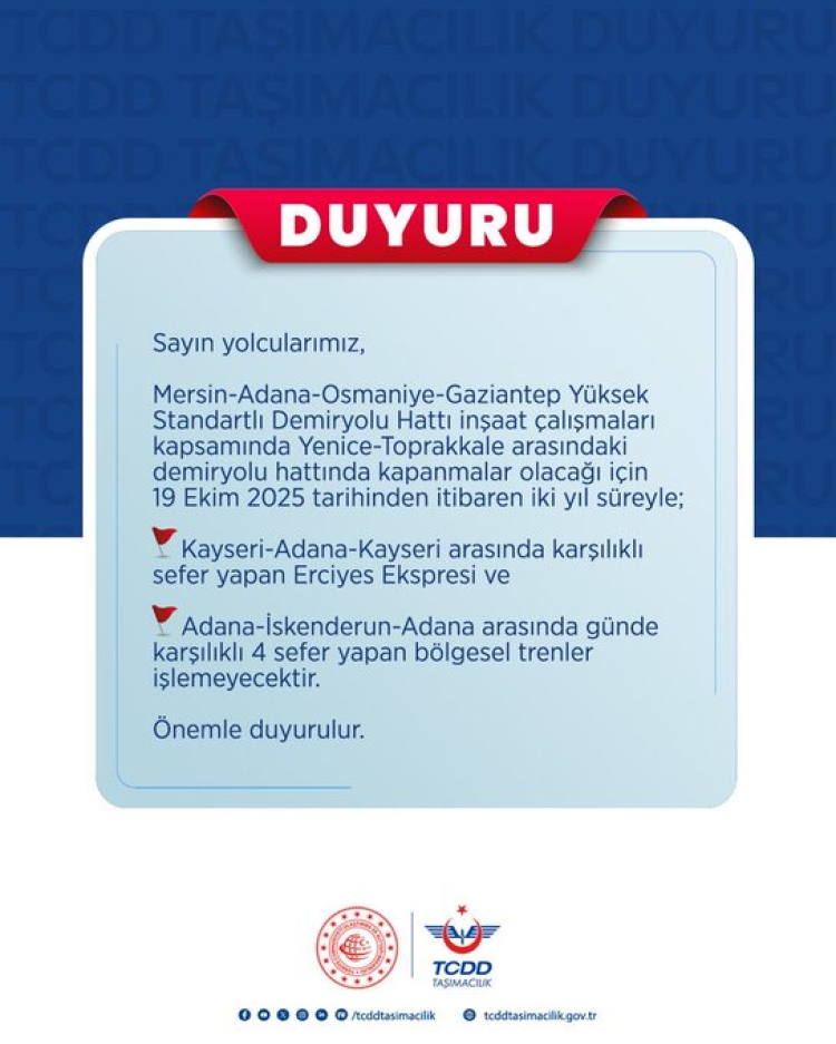 Bu kapsamda, 19 Ekim 2025’ten itibaren 2 yıl süreyle Erciyes Ekspresi ve Adana-İskenderun bölgesel tren seferleri yapılmayacak.