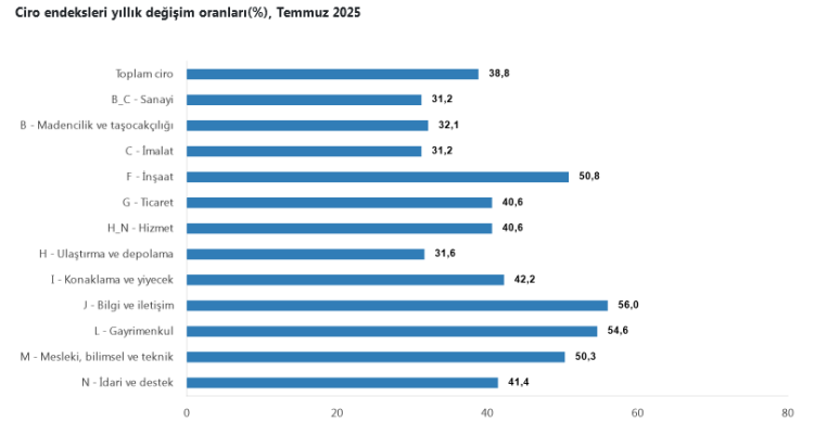 2025 Temmuz’da sanayi, inşaat, ticaret ve hizmet sektörlerini kapsayan toplam ciro endeksi yıllık yüzde 38,8, aylık ise yüzde 2,1 azaldı. Sanayide yıllık yüzde 31,2 artış, inşaatta yüzde 50,8 artış, ticaret ve hizmette yüzde 40,6 artış yaşanırken, aylık sadece inşaat ciro endeksi arttı.
