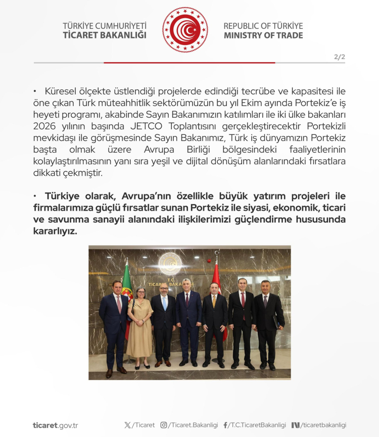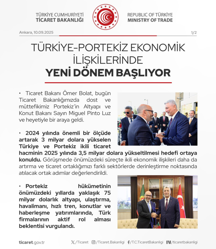 Ticaret Bakanı Ömer Bolat, Portekiz Altyapı ve Konut Bakanı Miguel Pinto Luz ile yaptığı görüşmede, 2024’te 3 milyar dolara ulaşan ikili ticaret hacminin 2025’te 3,5 milyar dolara çıkarılmasının hedeflendiğini açıkladı. Türk firmaları, Portekiz’in 75 milyar dolarlık altyapı yatırımlarında aktif rol alacak.